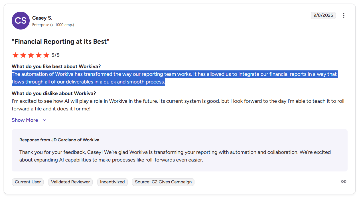 ‘’The automation of Workiva has transformed the way our reporting team works. It has allowed us to integrate our financial reports in a way that flows through all of our deliverables in a quick and smooth process.’’ – G2 Review.
