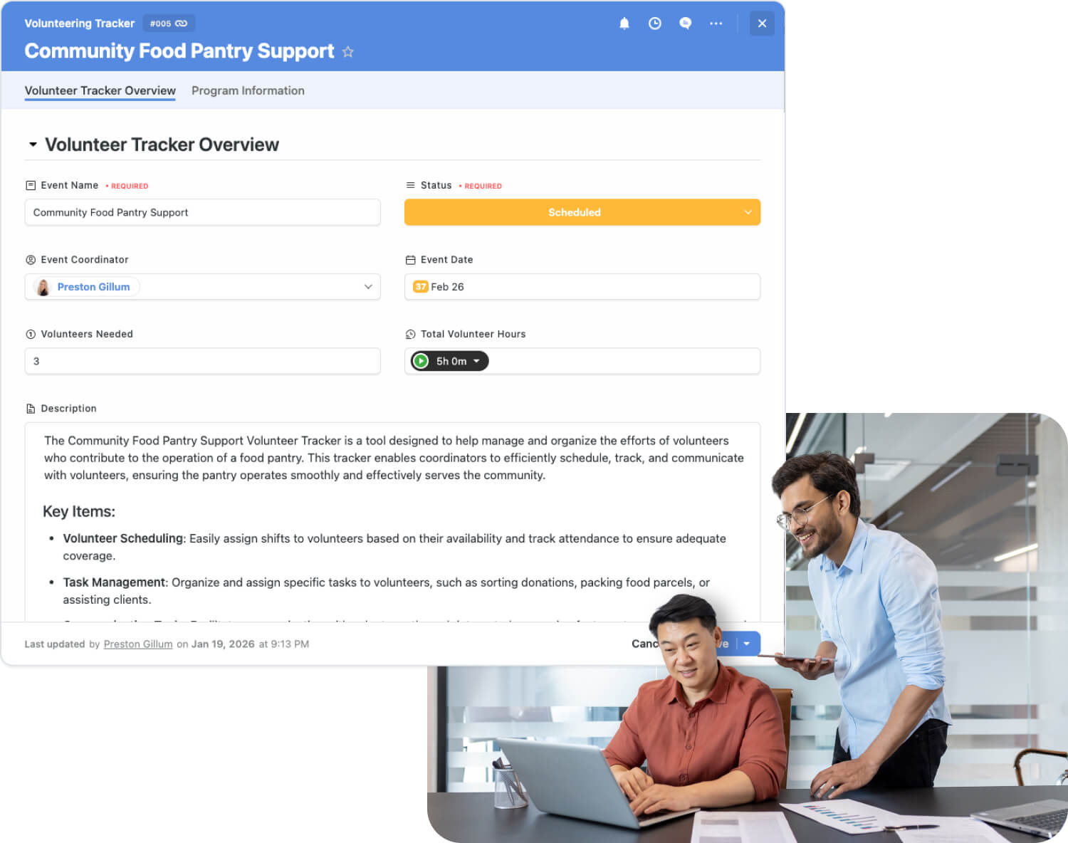 Absolutely. SmartSuite enables nonprofits to onboard volunteers, schedule activities, assign tasks, capture volunteer hours, and track participation using mobile-friendly workflows designed for distributed teams and events.