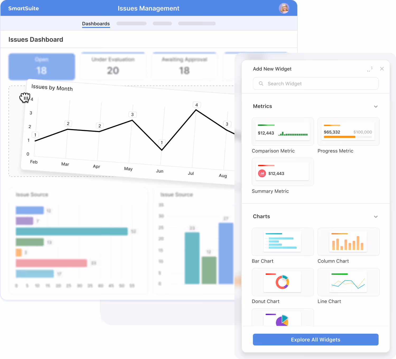 Dashboard and Reporting deliver enterprise‑grade analytics built right into SmartSuite. The reporting engine pulls data from any solution or table across your workspace, honoring every layer of access control so users only see authorized data.