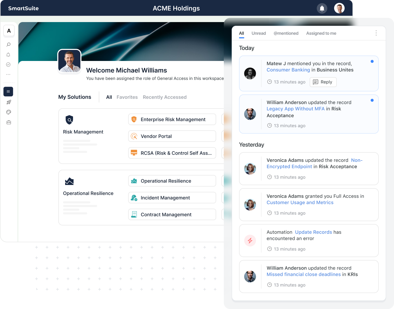 Teams shouldn't have to learn a new way of collaborating every time they touch a different system. SmartSuite gives you one consistent collaboration model that works across GRC, ITSM, projects, CRM, and more.