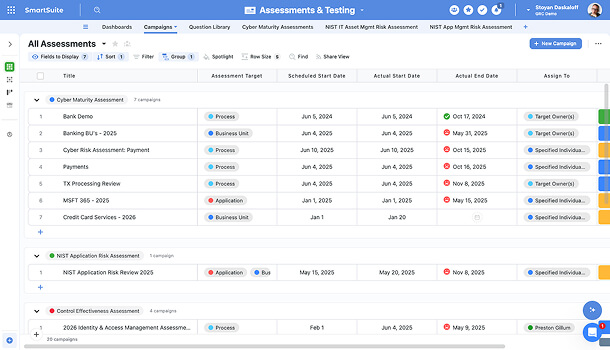 SmartSuite enables organizations to standardize assessment planning, control testing, and evidence collection across frameworks and business units. With a centralized system of record, teams can manage testing cycles, track results, and maintain complete audit trails in a way that is repeatable, auditable, and defensible.