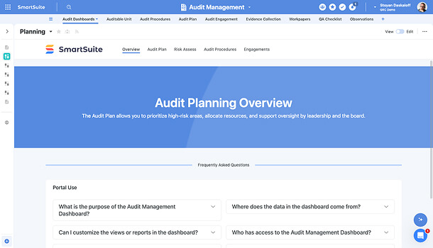 Modernize and Scale Your Audit ProgramAudit Management is the process of planning, executing, and reporting on audits to evaluate control effectiveness, compliance, and operational performance. SmartSuite’s Audit Management software provides a structured, scalable system to manage audit programs across your organization — ensuring consistency, accountability, and audit readiness.SmartSuite enables organizations to standardize audit planning, fieldwork, testing, and reporting across business units and frameworks. With a centralized system of record, audit teams can manage audit plans, track findings, and maintain complete documentation in a way that is repeatable, auditable, and defensible.The product supports internal audit, SOX, operational audits, and regulatory audits, while aligning with frameworks such as COSO, ISO, and internal governance standards.SmartSuite delivers real-time visibility into audit progress and outcomes, allowing teams to track audit status, monitor findings, and ensure timely remediation. This improves audit efficiency, reduces manual effort, and enhances overall governance.As part of SmartSuite’s connected GRC architecture, Audit Management extends beyond standalone audit activities.Audit data is continuously informed by:Compliance assessments and control testing resultsEnterprise and operational risk dataPolicy management and governance frameworksIncident and issue management activitiesThird-party risk and vendor assessmentsThis ensures that audits are not isolated exercises, but part of a connected, continuously improving system of governance and oversight.The product supports a wide range of audit use cases, including:Internal audit planning and executionSOX audit management and testingOperational and process auditsRegulatory and compliance auditsThe result is an audit program that is:Structured and defensible for auditors and regulatorsEfficient and scalable across audit cycles and frameworksTransparent and actionable for audit, risk, and compliance teams