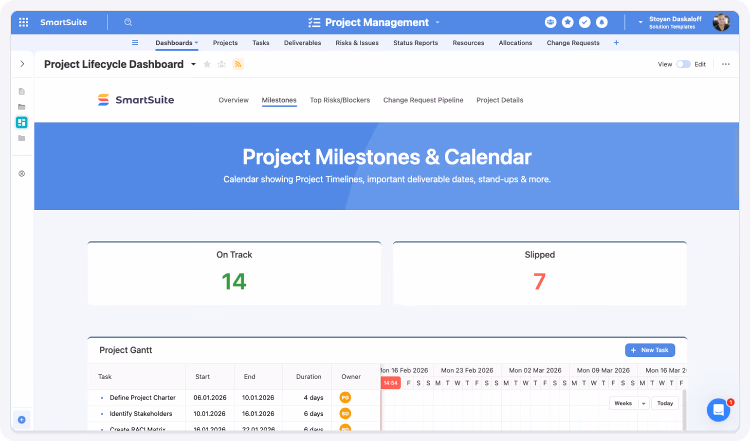 Centralize schedules, daily logs, inspections, issues, and subcontractor coordination in one connected workspace. SmartSuite links field activity to tasks, documentation, and approvals—providing faster resolution, stronger compliance, and consistent execution across every job site.