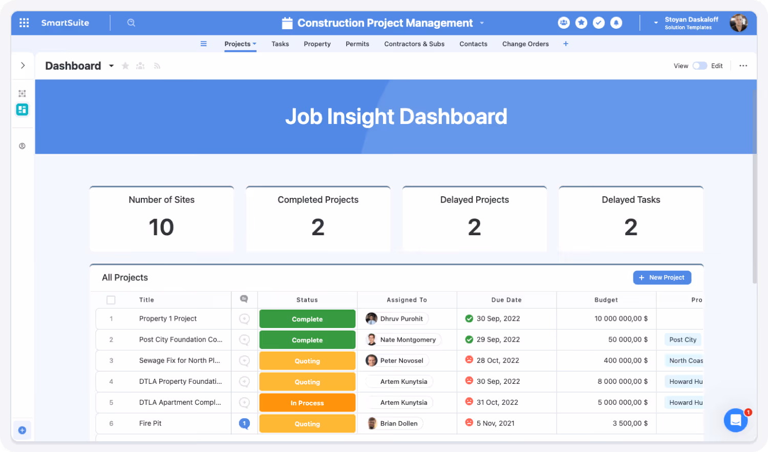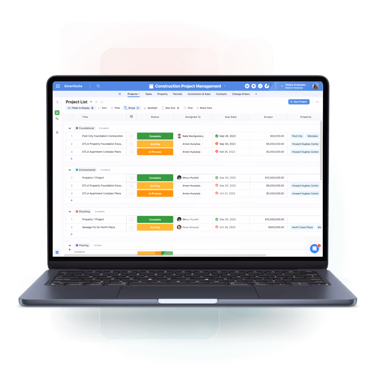 SmartSuite centralizes daily jobsite activity, project schedule updates, crew coordination, inspections, and issue tracking.Reduce delays, increase visibility, and streamline collaboration between field teams, subcontractors, and office staff.