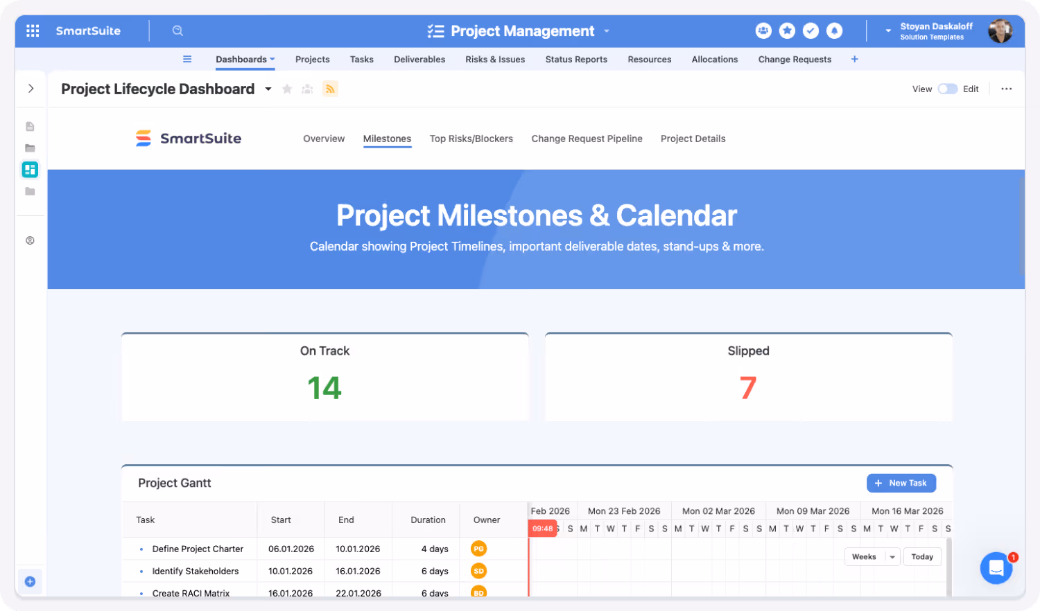 SmartSuite connects planning, content creation, reviews, and distribution across internal and external communication teams. Streamline messaging, improve collaboration, and deliver consistent, timely communication at scale — all from one unified platform.