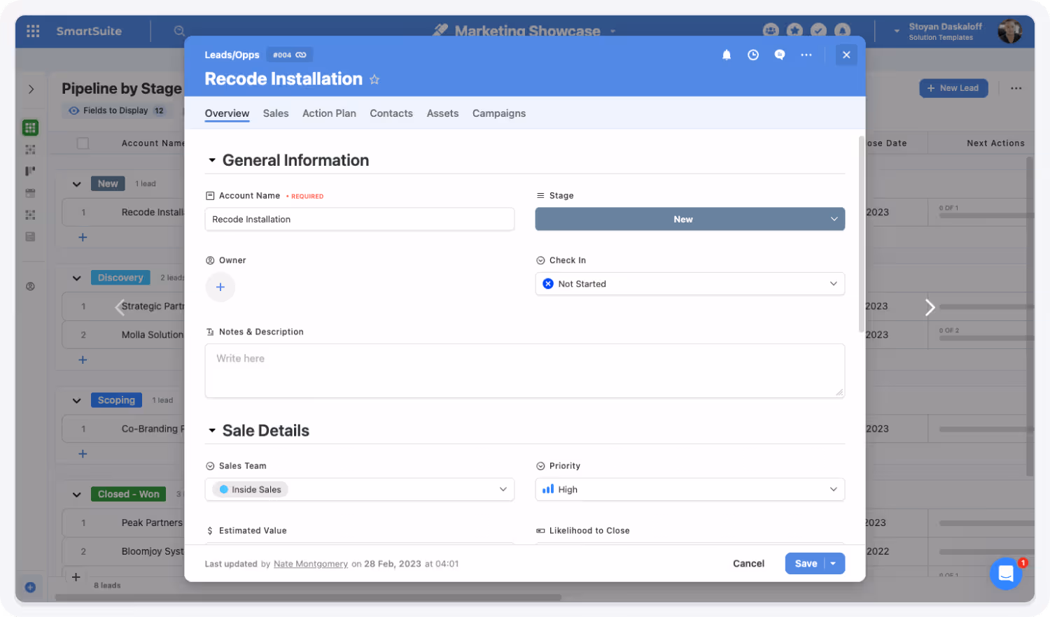 When a lead reaches MQL status, SmartSuite automatically assigns it to the correct SDR, notifies Sales, and triggers a follow-up task while updating the pipeline stage.