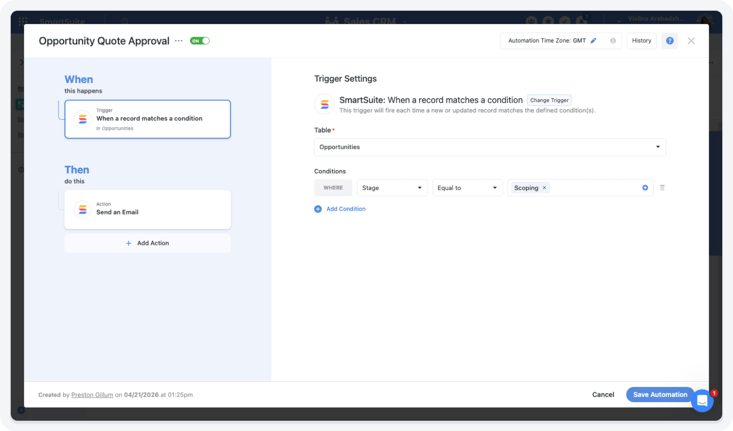 When a deal reaches “Proposal Sent,” SmartSuite assigns follow-up tasks and sends reminders to the Account Executive.