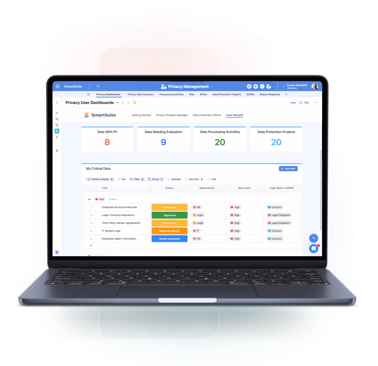 SmartSuite unifies privacy workflows, data inventories, DPIAs/PIAs, incident response, and compliance tracking in a single platform. Privacy teams gain full visibility into processing activities, risks, controls, and mitigation efforts — ensuring consistent governance across the organization.