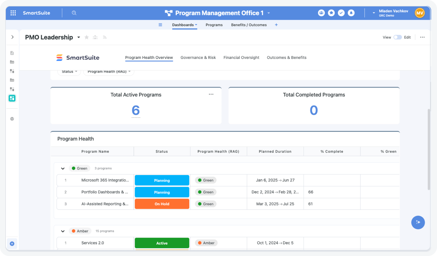 SmartSuite connects planning, execution, risk tracking, timelines, and reporting—so project governance becomes real-time and delivery stays predictable.