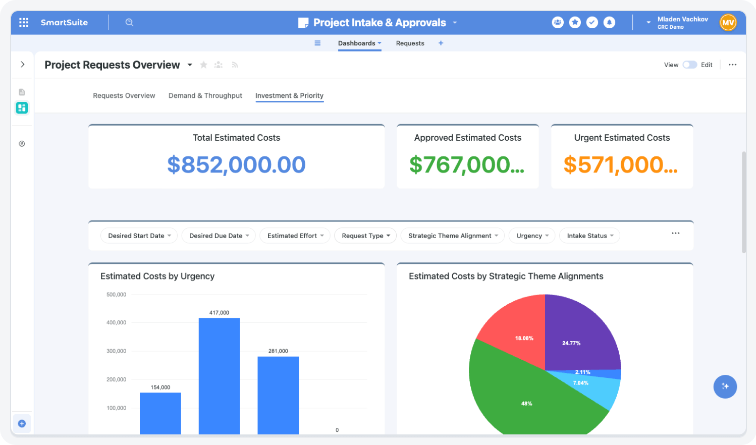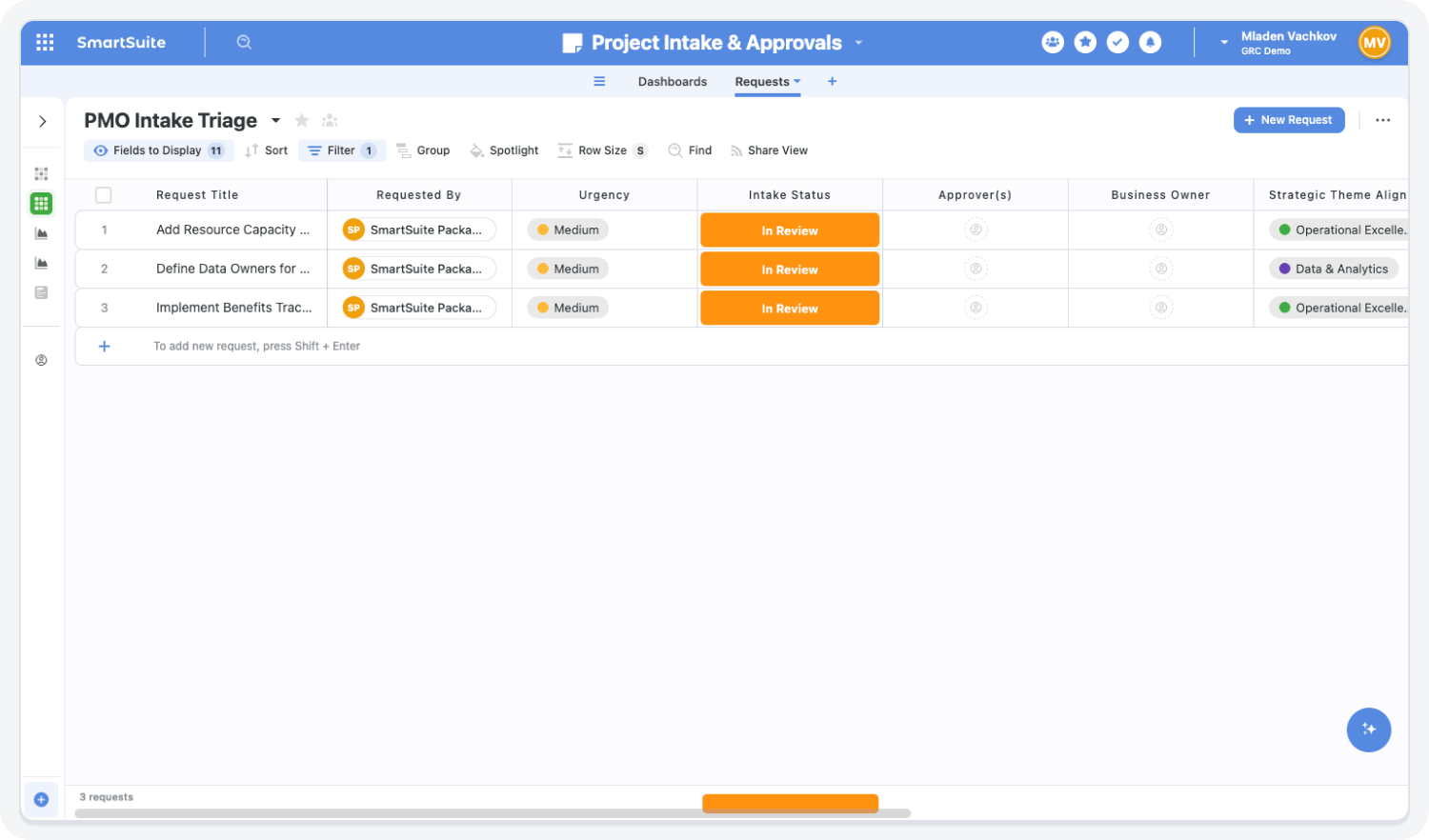 SmartSuite provides connected capabilities to capture demand, evaluate it consistently, route approvals, and convert approved requests into actionable work—without losing transparency or decision history.
