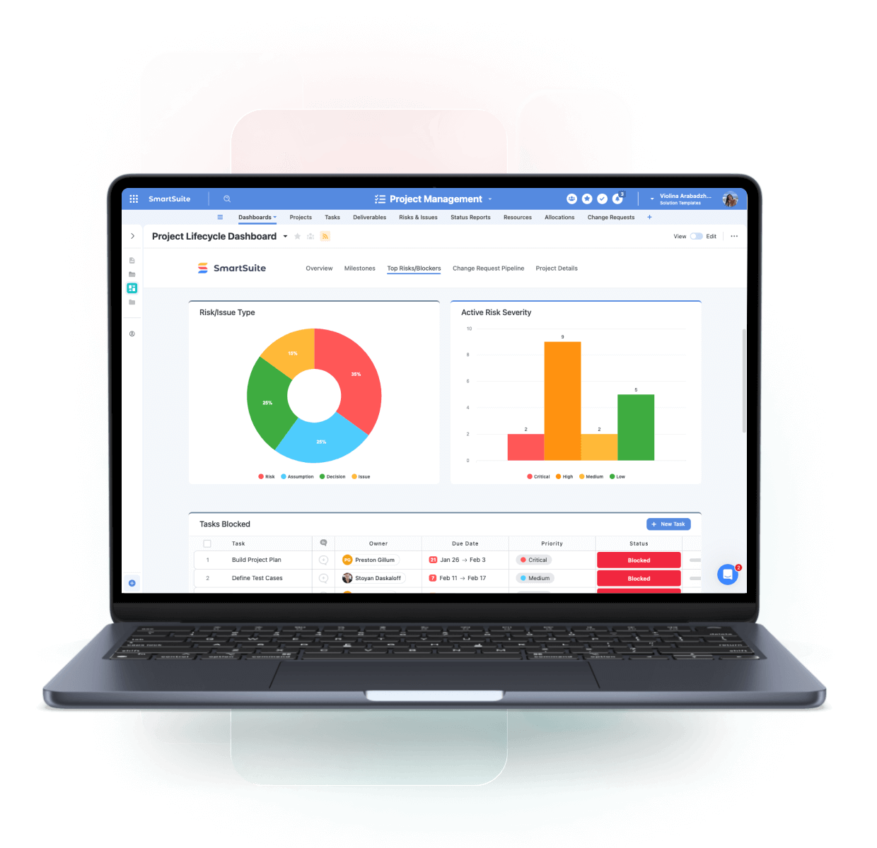 SmartSuite centralizes project planning, task execution, timelines, risks, and reporting in one connected workspace. Teams stay aligned on what’s happening now, what’s at risk, and what’s next—while stakeholders get clear visibility into progress and outcomes.