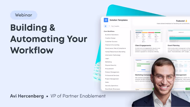 This webinar will discuss how to: • Organize your processes/projects in SmartSuite • Easily view your work status and activities • Customize your workflows • Create reports and forms • Set up automations - Live Q/A - bring all your questions and use cases!